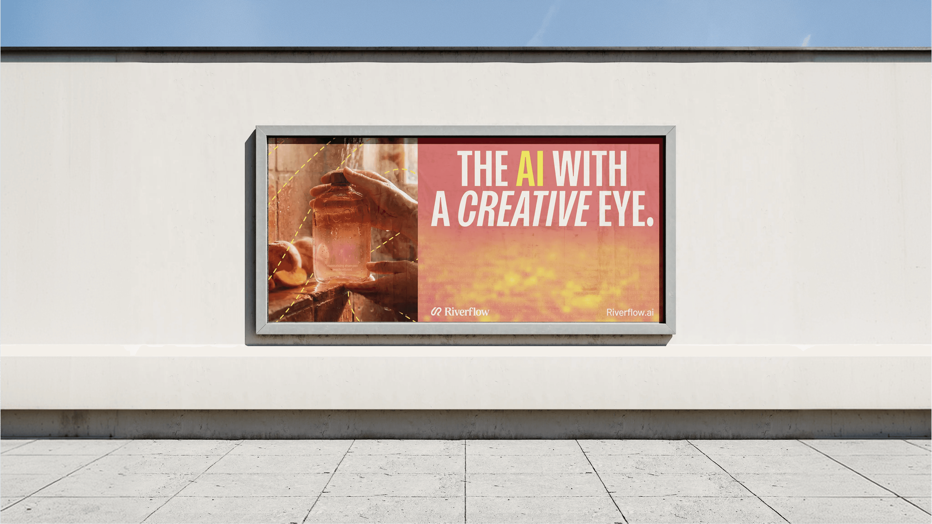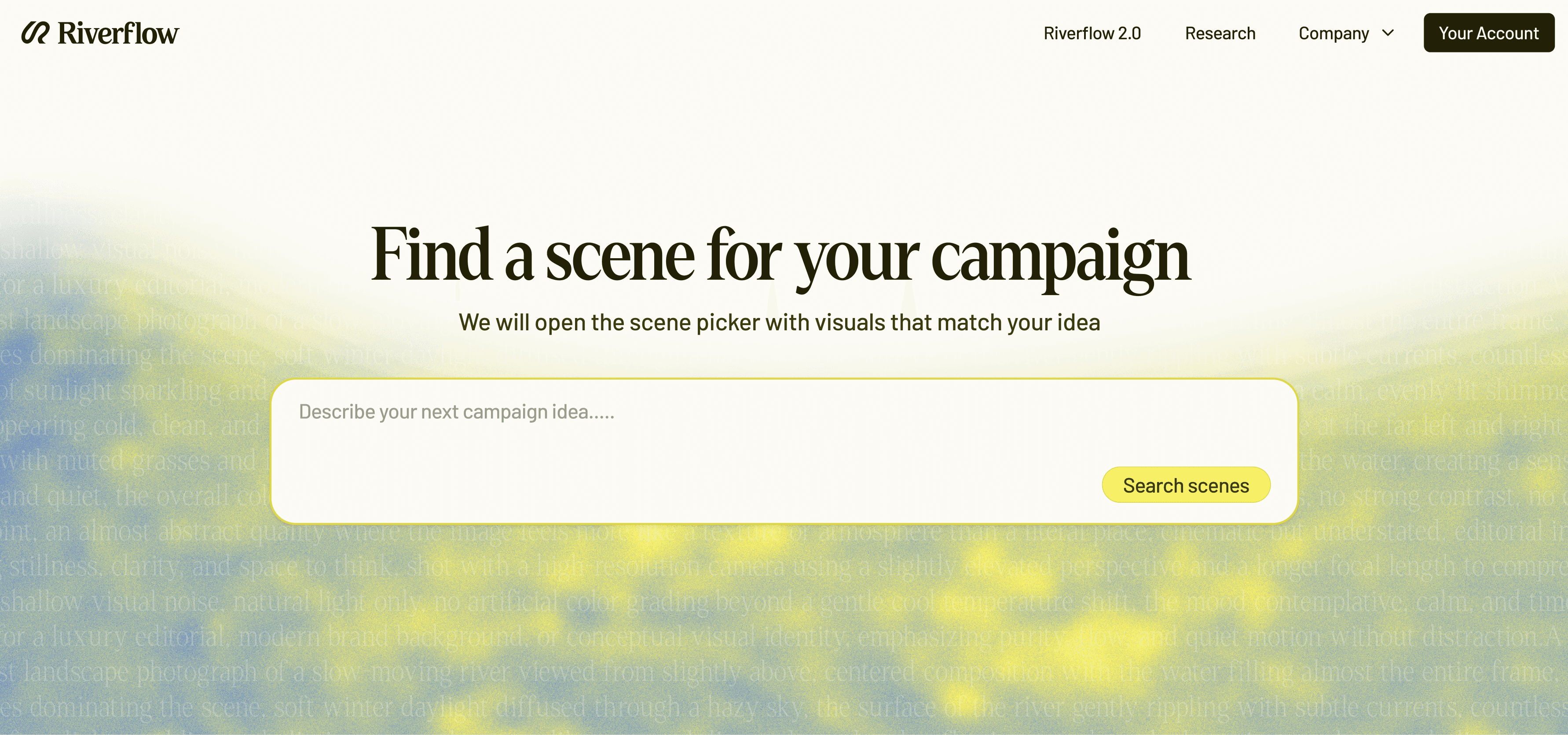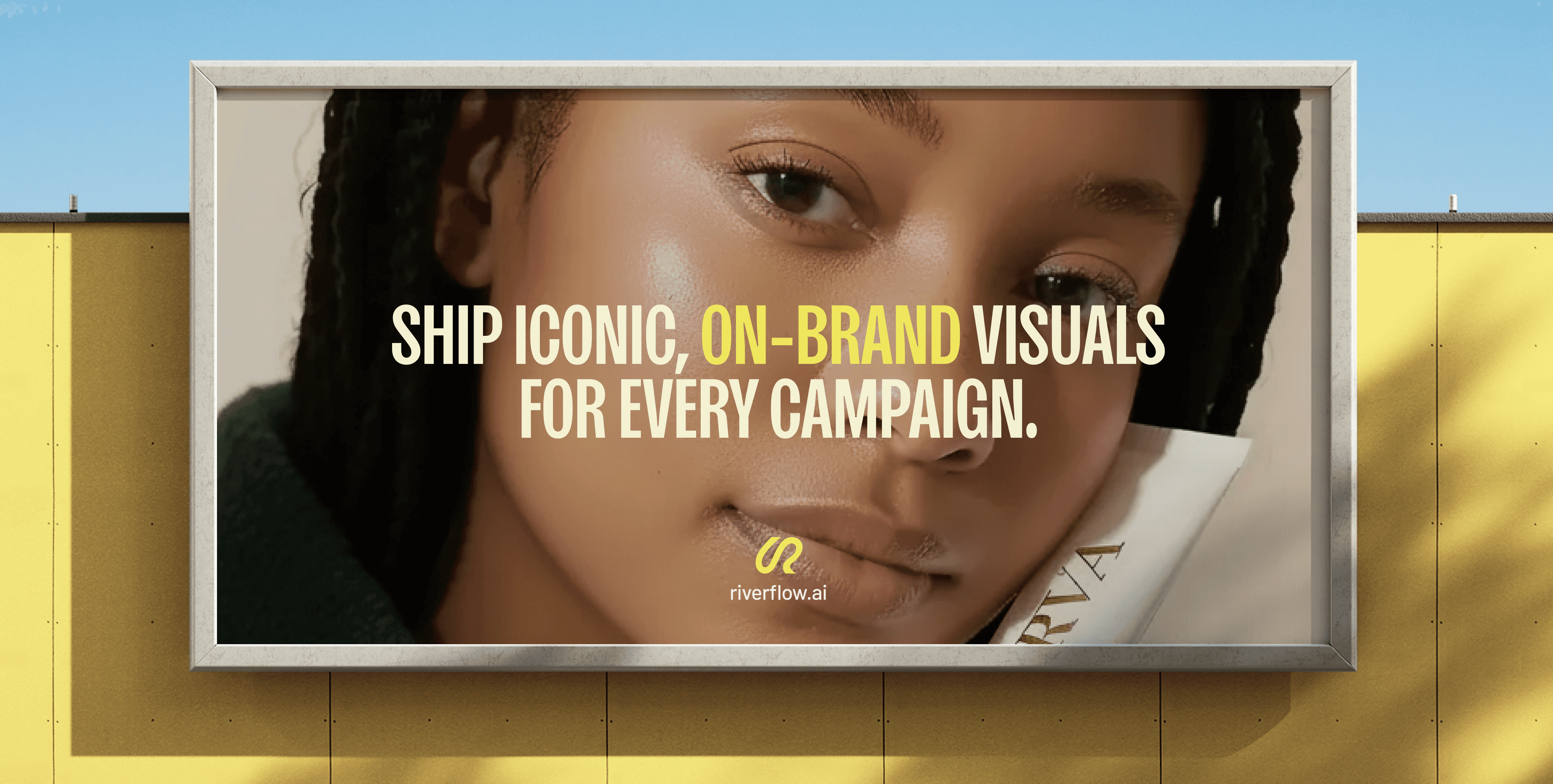 The visual world reframes Riverflow from tool to creative engine. Editorial typography, campaign‑grade imagery, and a confident yellow‑led palette position it closer to a fashion or beauty brand than a developer tool. Each module reads like a mini campaign case study, with bold headlines and tight copy explaining how Riverflow powers social, product, and brand visuals.