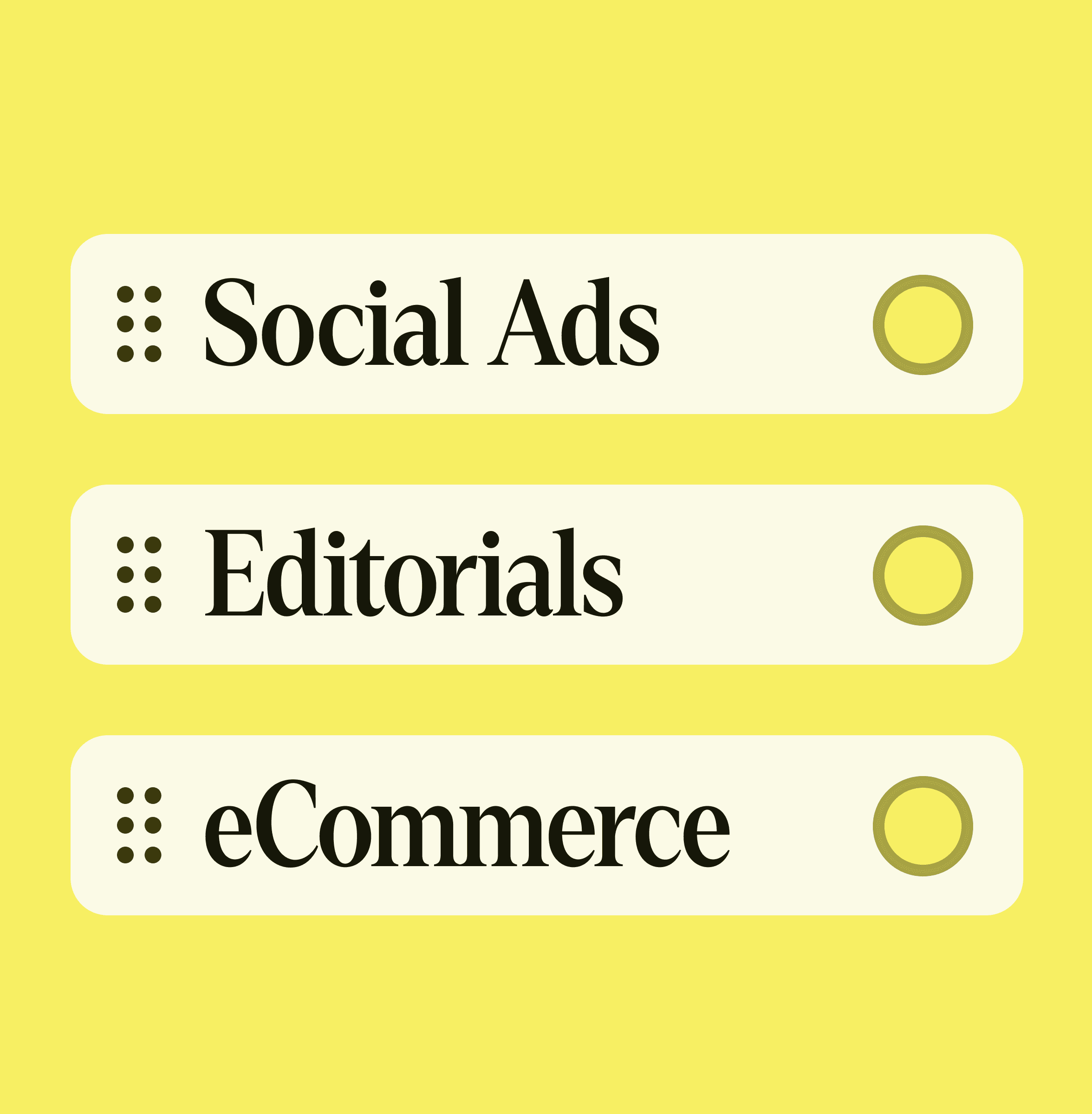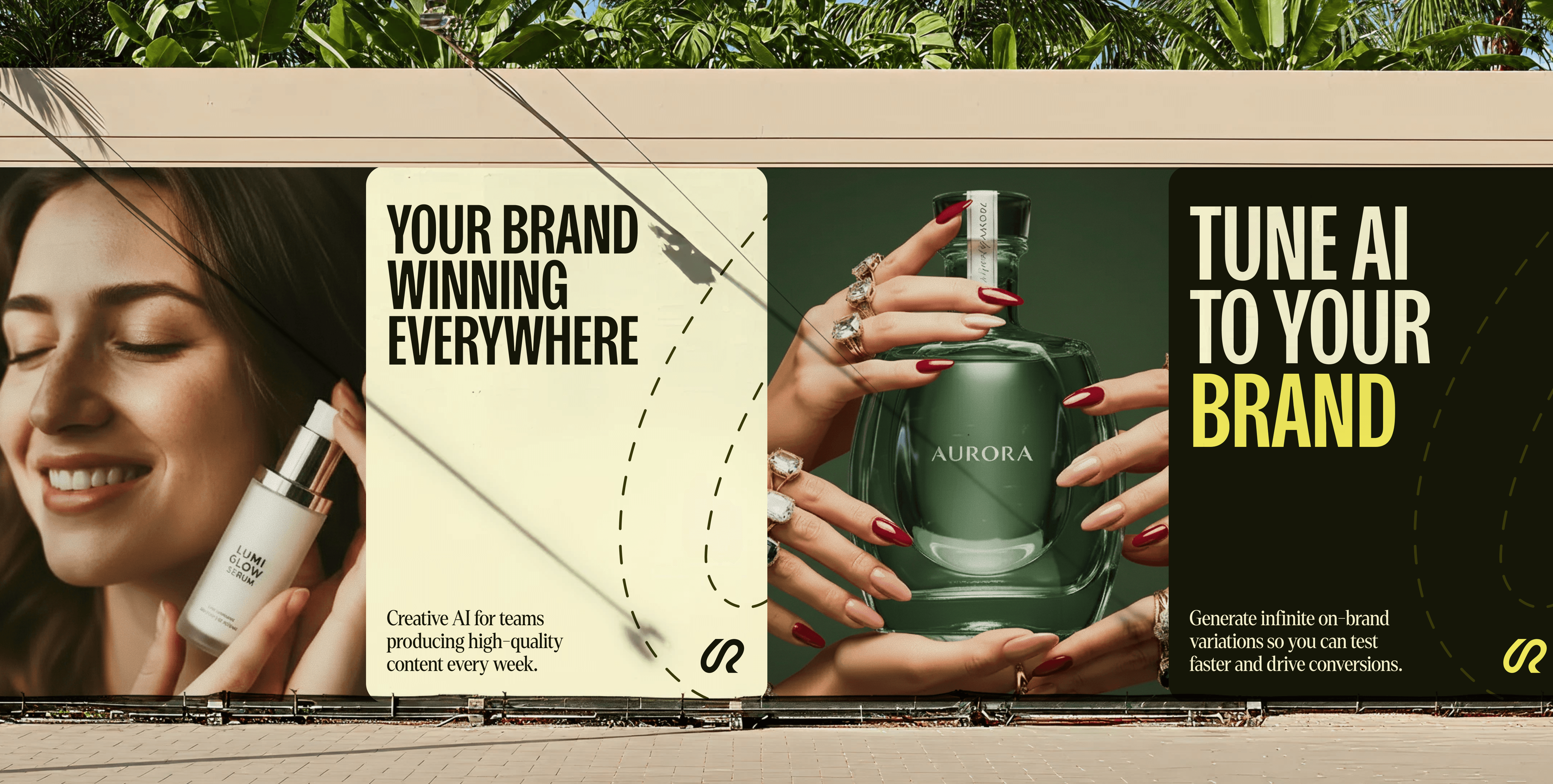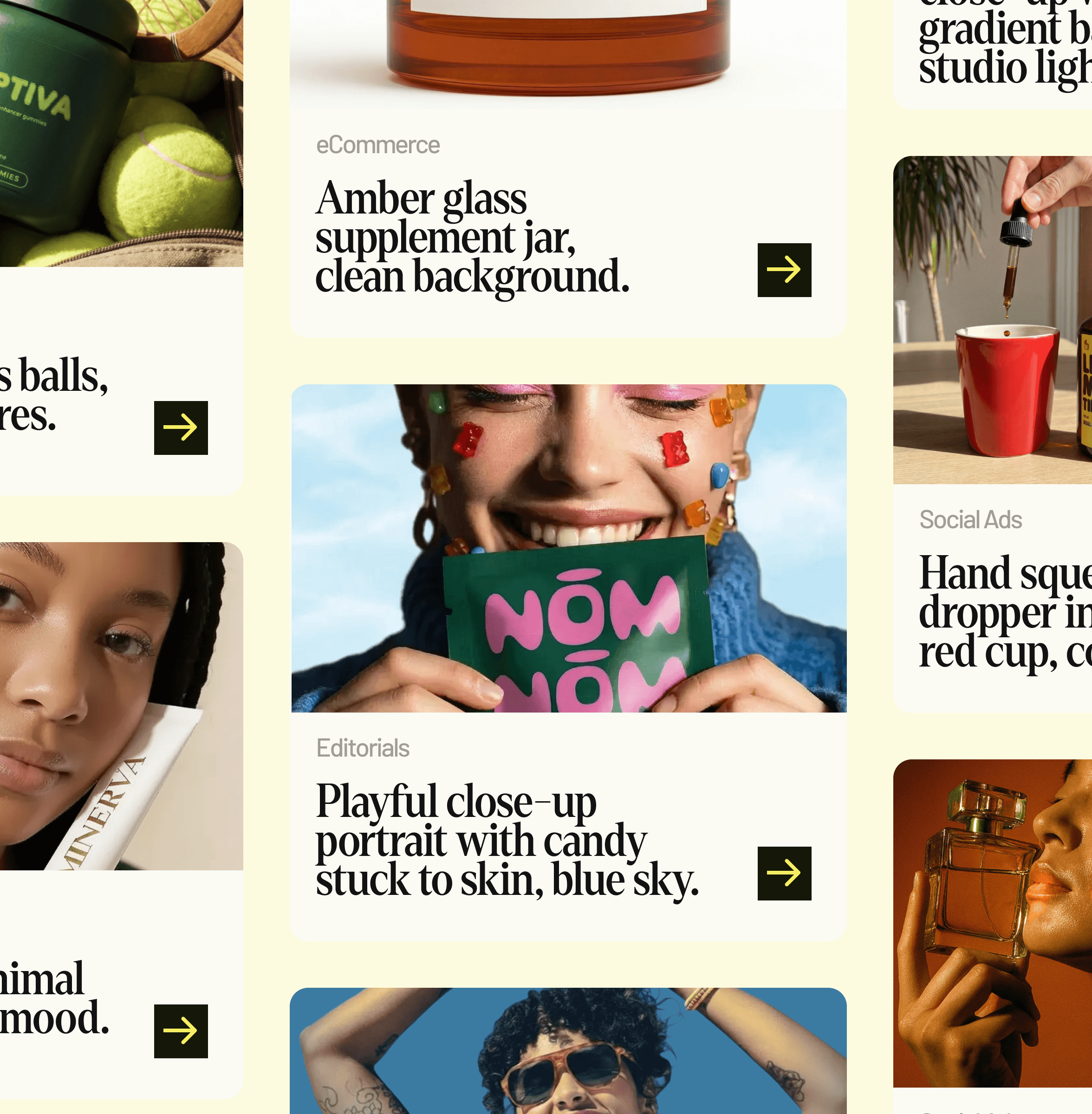 The visual world reframes Riverflow from tool to creative engine. Editorial typography, campaign‑grade imagery, and a confident yellow‑led palette position it closer to a fashion or beauty brand than a developer tool. Each module reads like a mini campaign case study, with bold headlines and tight copy explaining how Riverflow powers social, product, and brand visuals.